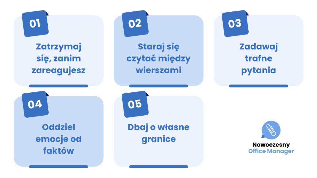 Zadawaj trafne pytania. Zamiast zakładać, że wiesz, co ktoś miał na myśli, dopytuj. Proste pytanie, takie jak: „Czy dobrze rozumiem, że…?”, często porządkuje sytuację i zmniejsza napięcie.